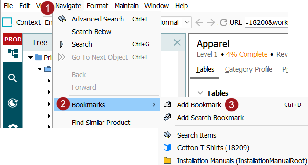 2. Either use the Ctrl+D shortcut, or on the Navigate menu, select Bookmarks and then Add Bookmark. Existing bookmarks are also displayed on this menu.
