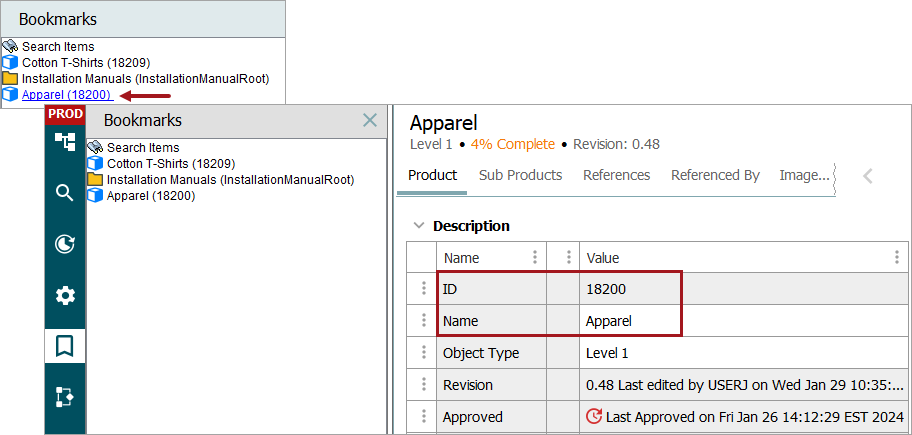 3. The new bookmark is displayed on the Bookmarks tab with the object icon and labeled with the object name and (ID).
