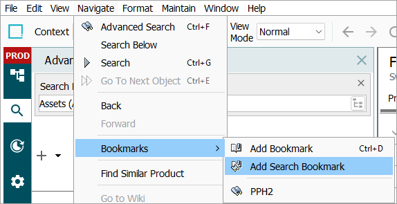 2. On the Navigate menu, select Bookmarks and then Add Search Bookmark. Existing bookmarks are also displayed on this menu.