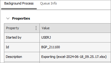 The Properties section includes the user who started the background process, an auto-generated unique identifier, the type of BGP performed (export, import, bulk update, etc.), status (Succeeded, Failed), creation date and time, start date and time, end date and time, time taken to process the request, number of warnings, and number of error messages.