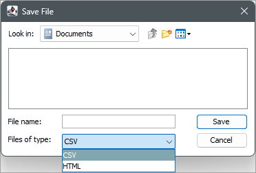 The Save button allows the user to download the execution report. Click the 'Save' button to display the 'Save File' window. Browse to the download location, add a file name, and click the 'Save' button. The file can be saved as a CSV or HTML file type. For larger files, CSV files can be zipped.