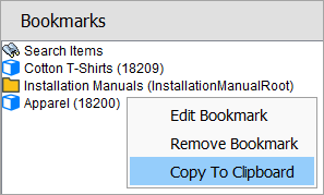 On the Bookmarks tab, right-click the bookmark to be shared or saved and click 'Copy to Clipboard.'