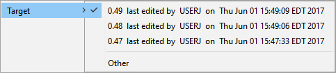 In the Revision view mode, this allows the user to select a past revision(s), provided there is a recorded change in STEP. If the revisions are older than the current session, the 'Other' option will display a window to select necessary revision for comparison. When the Revision view is selected, the selected object will show the current version and the immediately previous version. By using target, users may select specific revisions for comparison.