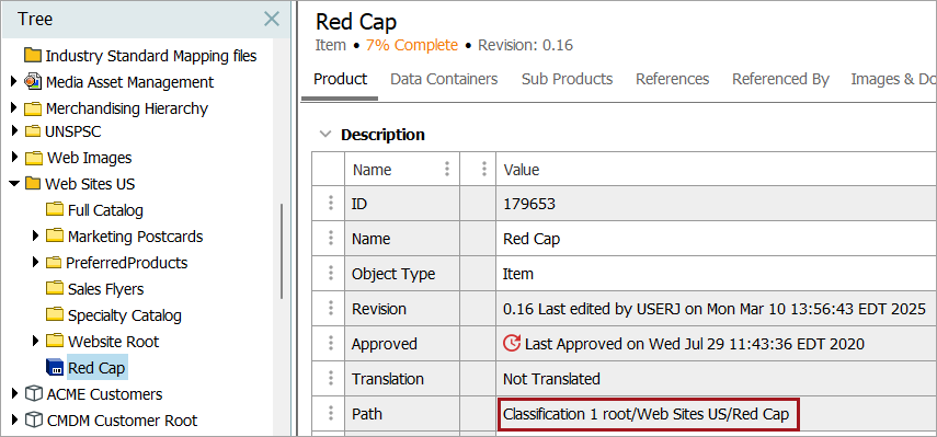 In the below example, Object 'Red Cap' is a product object type being viewed in the Primary Product Hierarchy. This path echos the location of the object in the Tree tab.