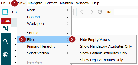 Select a view to filter out empty attribute values, show only mandatory attributes, show only editable attributes, and/or show only legal attributes.