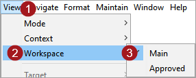 Workspace shows all available workspaces. It is possible to change the viewed workspace and view objects as they appear in different workspaces. In this example, there are only two workspaces: Main and Approved. However, more can be added as desired. For more information on setting up and using workspaces, refer to the Workspaces topic in the System Setup documentation.