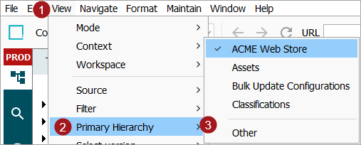 An objects' path can be changed based on the selected primary hierarchy. To change the display view, select Primary Hierarchy from the View menu, and then select the desired hierarchy. For many, the Primary Product Hierarchy will be the default selection.