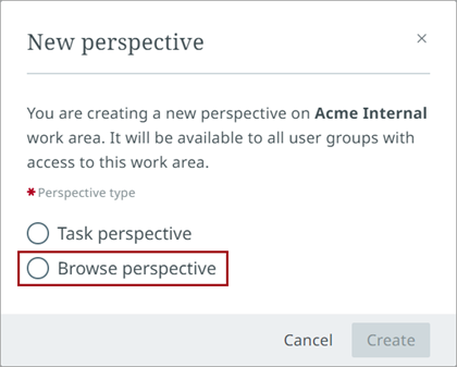 Mandatory fields in the dialog will be marked with a red asterisk '*'. Users cannot create a perspective without completing the mandatory fields.