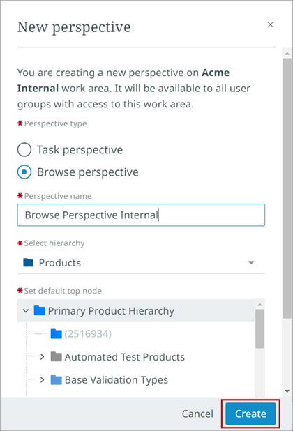 Name the Browse perspective, then select a hierarchy and a top node. For the hierarchy, you can choose Products, Classifications, or Collections.