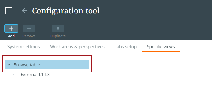 To create a new browse table configuration, select the Specific Views tab.