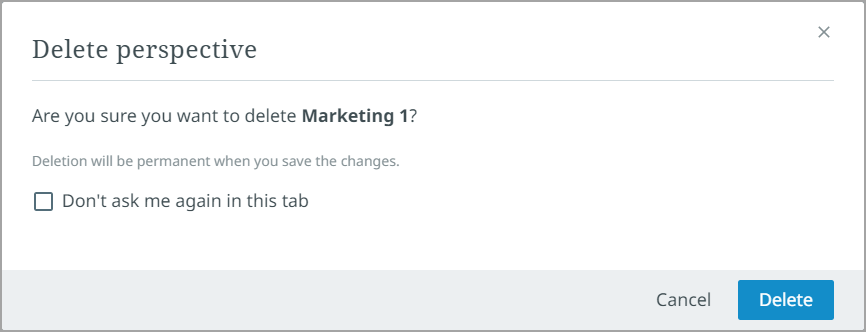 A dialog will display to confirm if the user wants to delete the perspective. The dialog has an optional selection box that states, 'Don't ask me again in this tab.' When checked, the 'Delete tab' warning dialog will not display again, and the remove button will immediately delete the selected tab when the '-' button is selected.