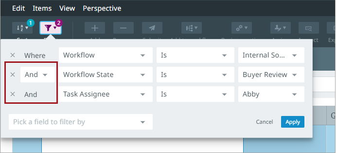 Filter options will filter the data that displays in the table for Tasks perspectives. Available filters include: Workflow, Workflow State, Workflow Status flag, and Workflow assignee. As filters are selected, the Configuration tool includes an implicit 'AND' between the filters, resulting in a cumulative filter search.