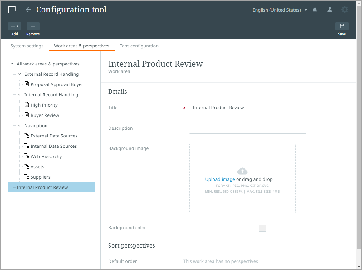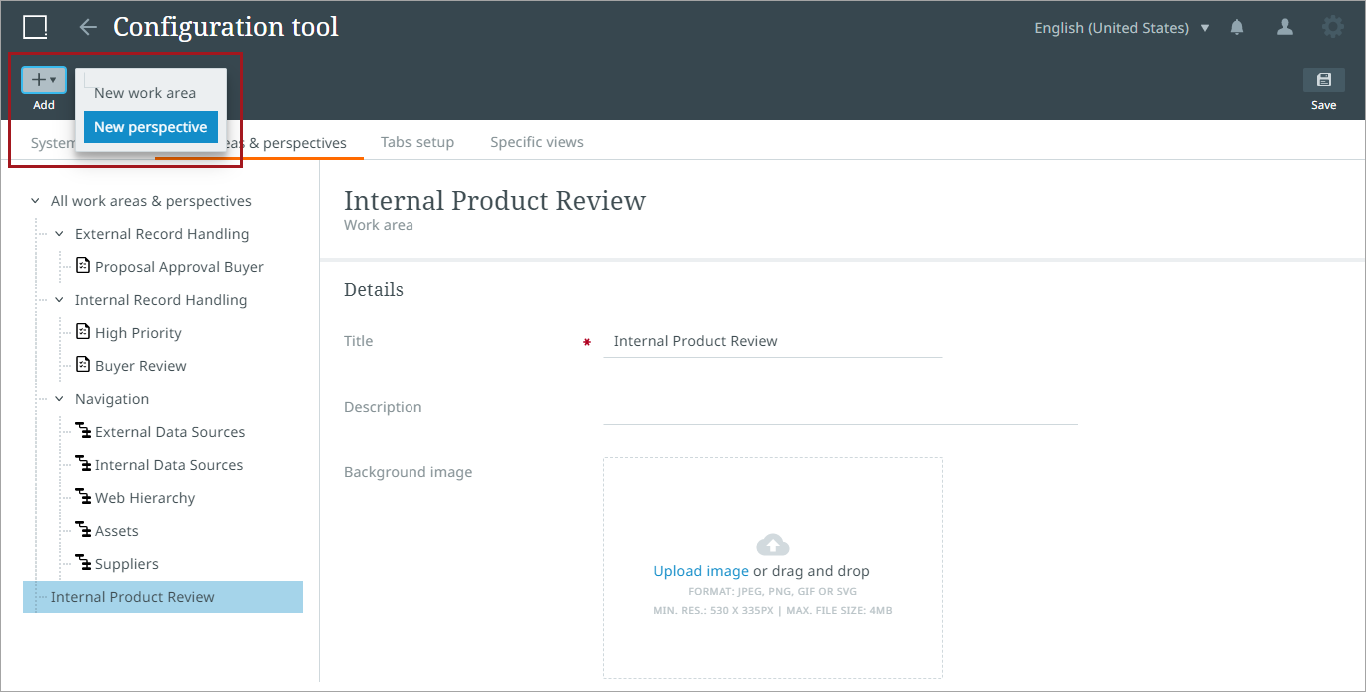 To create a new work area, click the 'Work areas & perspectives' tab on the Configuration tool homepage.