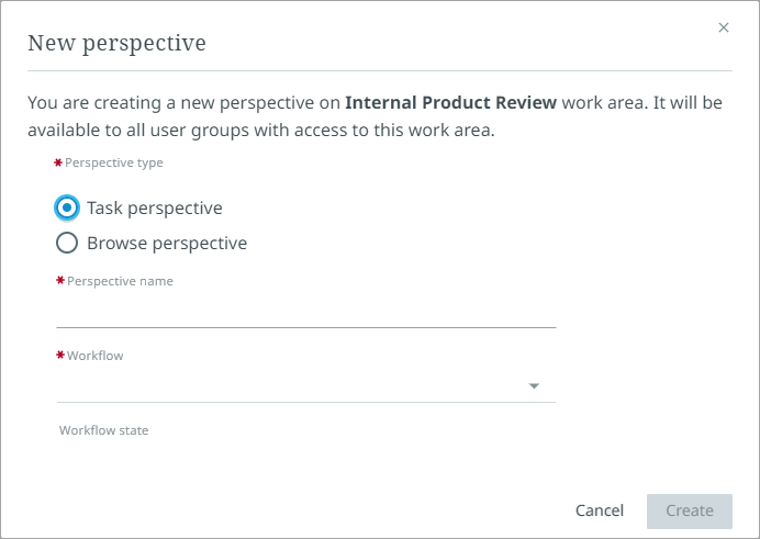 A 'New Perspective' dialog will display. Mandatory fields in the dialog will be marked with a red asterisk '*'. Users cannot create a perspective without completing the mandatory fields.