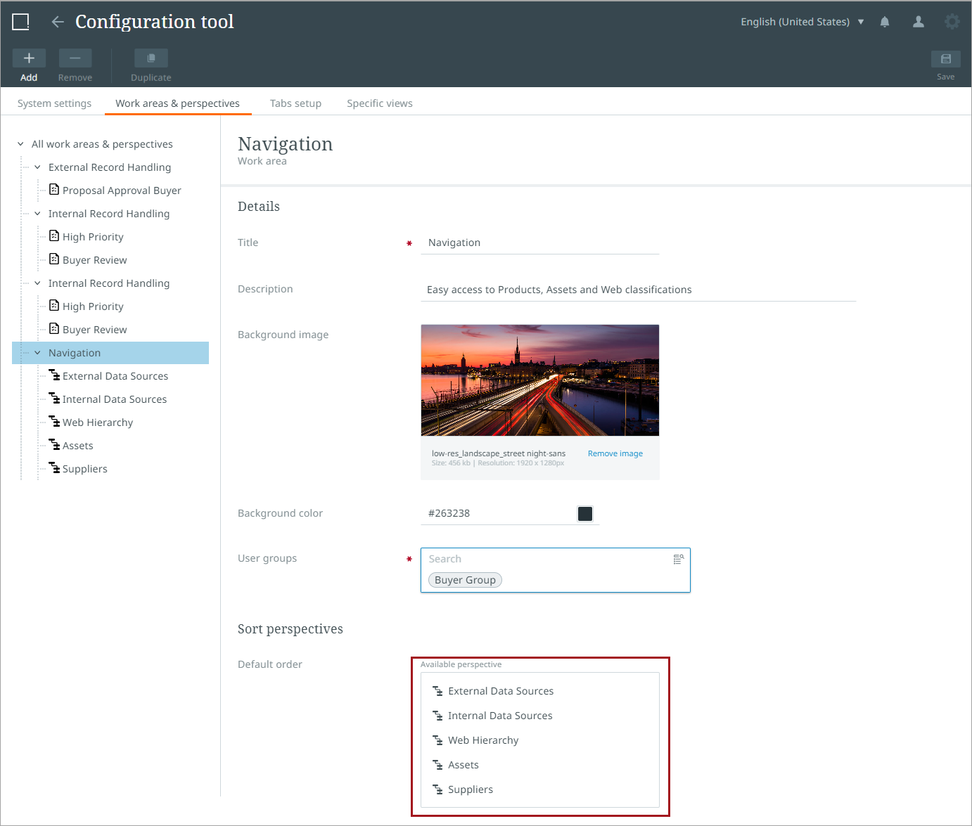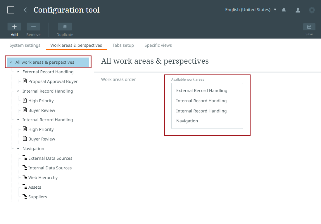 Admin users can configure and manage preset work areas and perspectives in the Configuration tool. The tool can also be used to assign preset work areas and perspectives to user groups specific to tasks and roles.