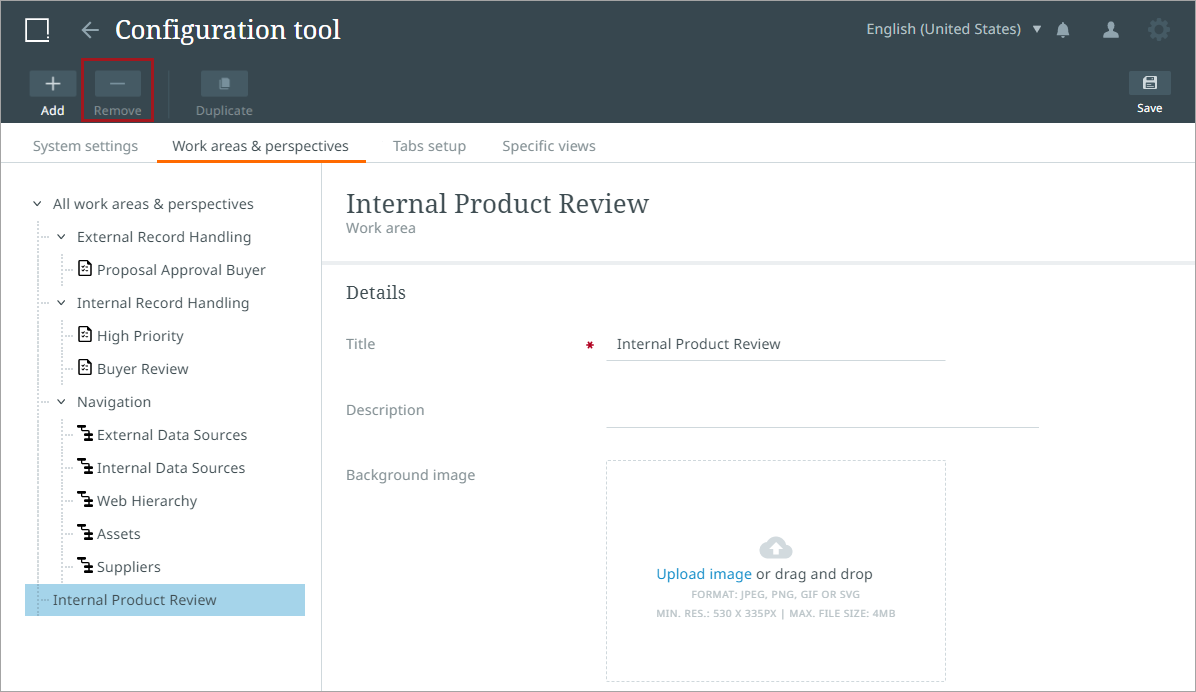To remove a work area, select the work area in the left navigation panel.
