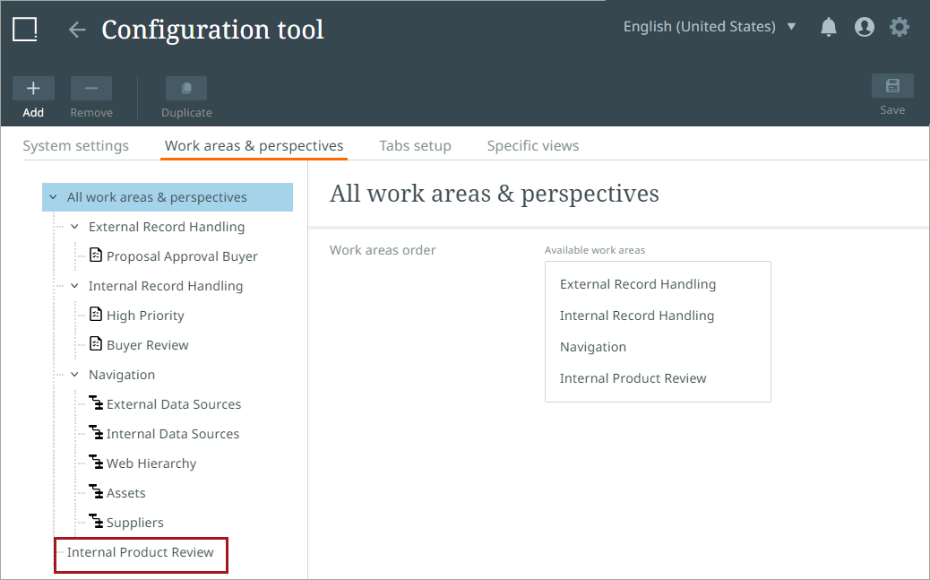 The new perspective will display beneath the work area in the navigation tree menu on the left side of the page as well as under the 'Sort Perspectives' option on the work area editor screen.