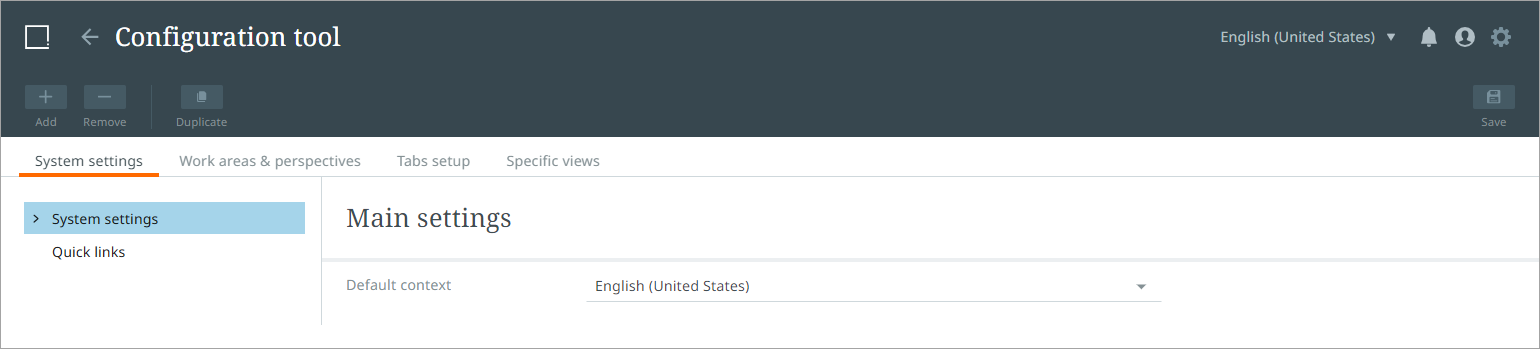 To configure system settings, click the 'System settings' tab in the Configuration tool. On this tab, the admin user will be able to configure the default context and quick links.