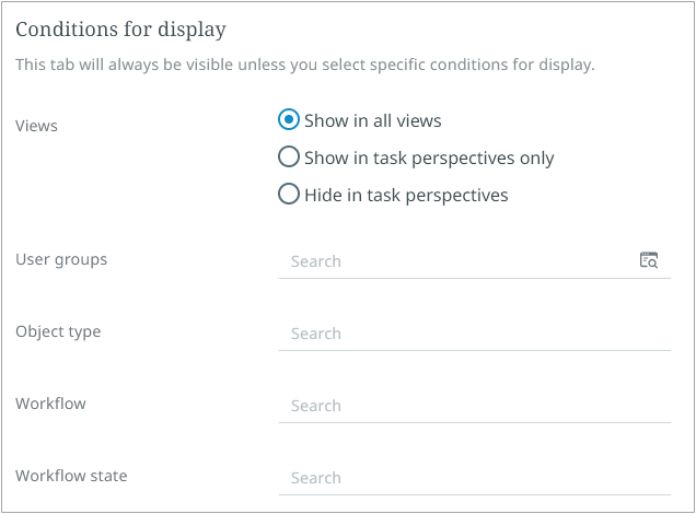 The admin user can set conditions for tab display using the options found under the 'Conditions for display' section. Conditions for display can be combined and include: Views, User groups, Object type, Workflow, and Workflow State. These parameters are listed and described below.