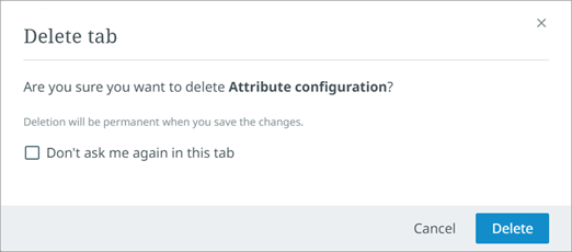 Next, click the '-' button in the toolbar. The 'Delete Tab' dialog will display. Click delete to close the dialog. The dialog has an optional selection box that states 'Don't ask me again in this tab.' When this box is checked, the 'Delete tab' warning dialog will not display again, and the remove button will immediately delete the selected tab when the '-' button is selected.