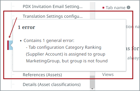 Note: If a work area, perspective, view, or tab is misconfigured, a red-line error indicator will display to the left of the affected configuration element. Hovering the cursor over the red line prompts an informational pop-up to display. The pop-up describes the issue causing the configured element to be misconfigured, (as shown in the screenshot below), giving the user the information needed to make the appropriate change.