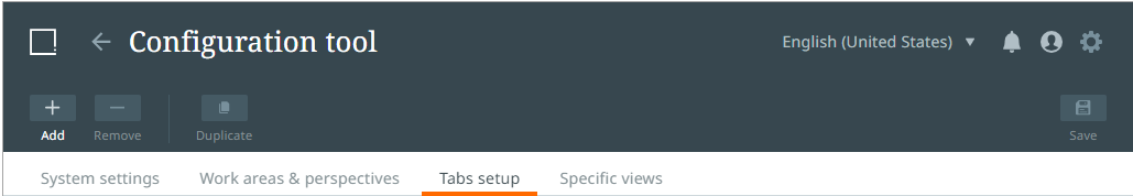 The Configuration tool's 'Tabs setup' functionality allows admin users to configure preset tabs for the details view. To access the 'Tabs setup' page, click on the Configuration tool icon in the upper-right hand corner of the screen. From the configuration tool home page, click on the 'Tabs setup' option.
