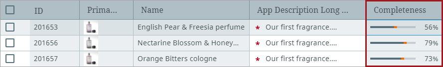 Once the Completeness column is added, the completeness score (based on the default metric) for individual products can be viewed in the list view.
