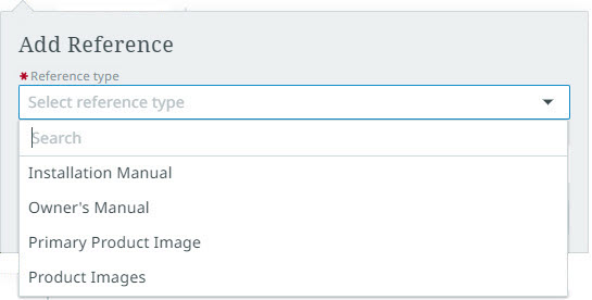 To add a new asset reference, first, click the arrow in the 'Reference type' field to display the dropdown. A list of available asset reference types will display. Select the reference type of the asset you want to reference.