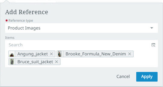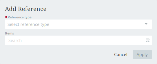 The 'Add' button enables users to add references to assets from the object being viewed. When the 'Add' button is clicked, a dialog displays with two fields: 'Reference type' and 'Items.'