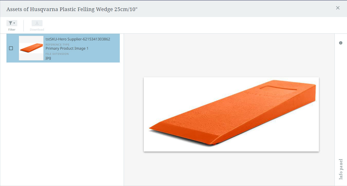 The 'Assets' tab, available in the details view, presents all referenced assets in a gallery view. The assets display as tiles that show either thumbnails or icons to represent the asset. The functionality available in the tab enables users to view, filter, expand, download, upload, add, and remove assets associated with the viewed product.