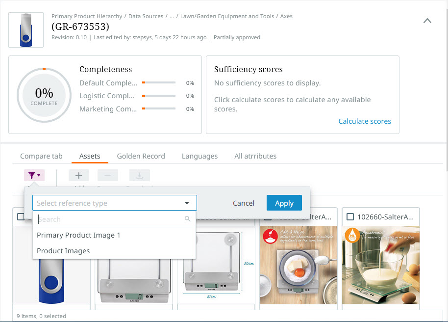 For instance, if the user only wants to view the referenced assets of the 'Product image' reference type, users can select 'Product image' from the list of reference types and restrict the tiles that display to only those assets that use the 'Product image' reference type.