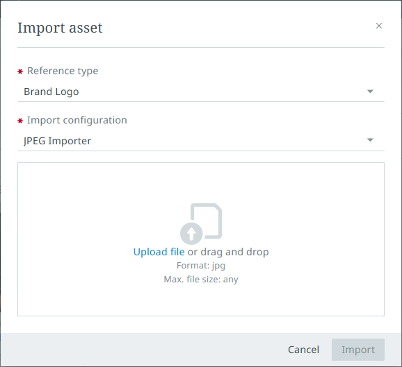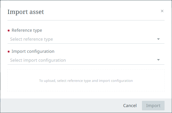 The 'Import' button allows users to import assets for the viewed object and create an asset reference between the object and the asset. When clicked, an 'Import asset' dialog displays.
