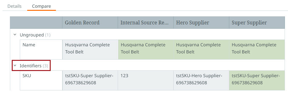 The records displayed on the tab include the golden record, the internal record, and the external record(s) associated with the product. Each record displays in its own column. The golden record and internal source records are displayed in the 'Golden Record' and 'Internal Source Record' columns, respectively, and the external records are displayed in columns named with the ID of the supplier that submitted the record. If multiple suppliers submitted product data for the same product, multiple external records will display in multiple columns, each named with the supplier ID.