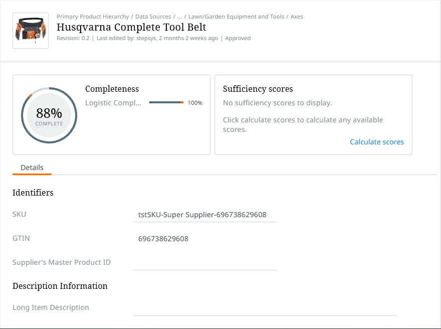 Information found within the details pane includes: attributes, attributes groups, references (provided they are in attribute groups), primary image, last edit date, Completeness card, Sufficiency scores card, and product hierarchy breadcrumbs. Attributes and references can be edited by clicking into the text field.