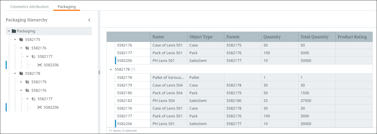 Selecting a lower lever packaging object in the hierarchy will narrow down the displayed data in the table(s) to only display child objects. The number that displays beside the header of each table indicates how many packaging objects and products are currently being displayed.