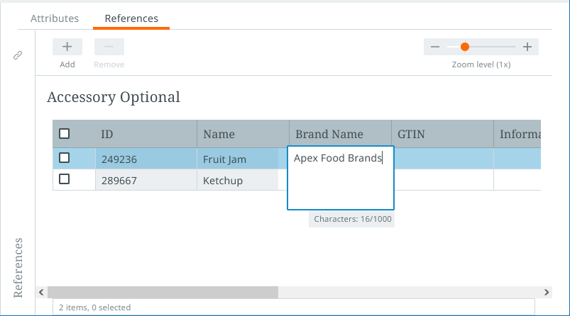 In the table that displays the references for each reference type, information on the referenced object can be edited. The buttons above the table in the secondary toolbar allow users to add new references by clicking the 'Add' button and remove existing references by selecting the relevant reference and clicking the 'Remove' button. A zoom slider is accessible above the table that expands table rows to display all relevant content.