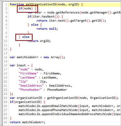 In the code section add the required JavaScript, using the if(node){}else{} function demonstrated below.