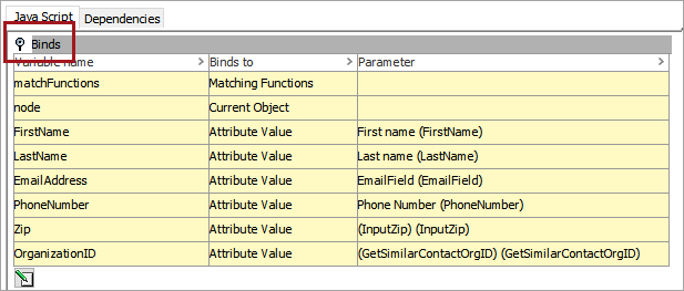 Open the Binds flipper and define all required binds. For information on JavaScript binds, refer to the topic JavaScript Binds in the Resource Materials online help documentation.