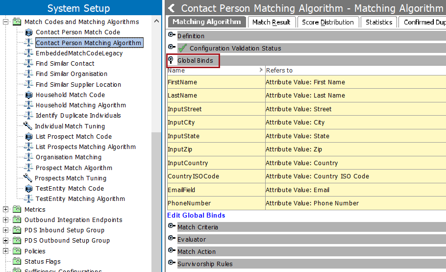 When customer data normalizers are used in the matching algorithm, the name of the global bind must match the ID of the corresponding attribute.