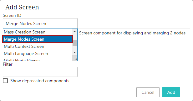 2. In the 'Add screen' window, select 'Merge Nodes Screen', enter a Screen ID, and click Add.