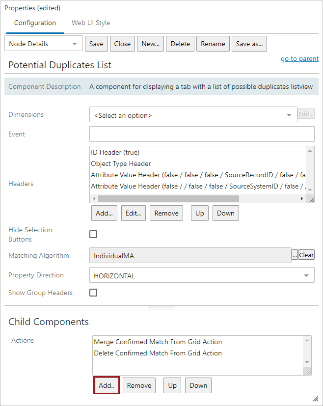 1. In design mode, select a 'Potential Duplicates' component screen. If one does not exist, configure it on any Tab Page or Node Details component as defined in the topic Potential Duplicates List.