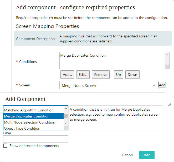 3. On the Screen Mapping dialog, under 'Conditions', click Add, select 'Merge Duplicate Condition', and click Add.