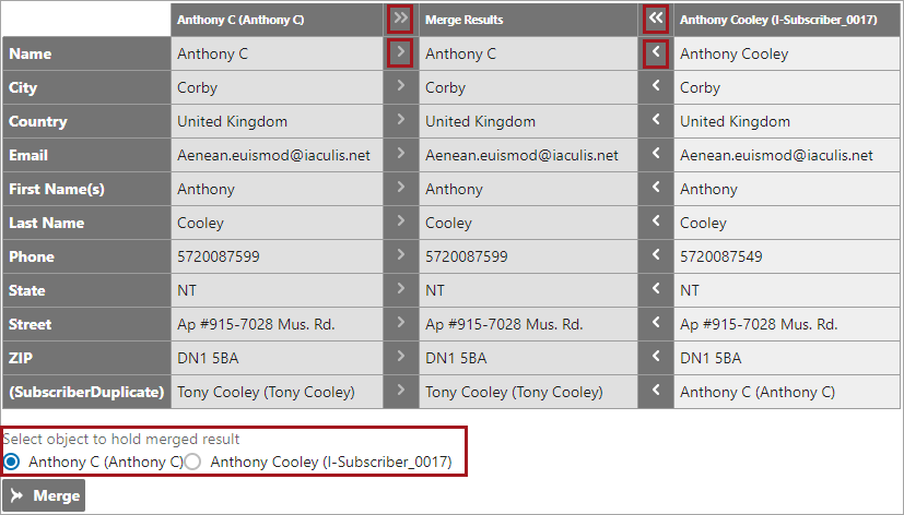 Note: Surviving attributes / references appear in the center 'Merge Results' column. Select the surviving node via the radio buttons that appear above the Merge button.