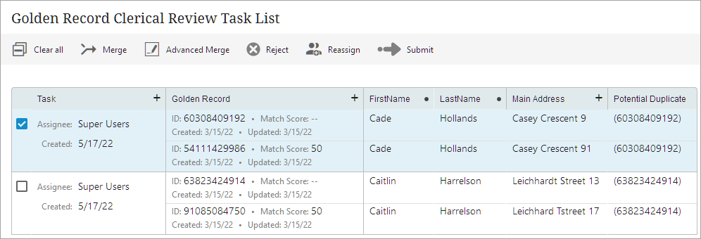 To be included on this screen, a golden record must have been flagged as a potential duplicate by the relevant matching algorithm during import. This means that it fell within the clerical review threshold of the matching algorithm and was initiated into a clerical review workflow where it can be evaluated against other records. Potential duplicates that are matched together are grouped into distinct tasks in the workflow, as pictured below.