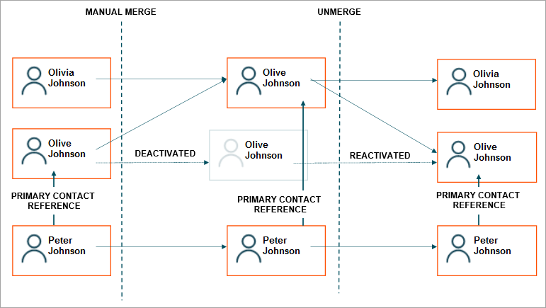 In the example below, the three customer records (Olivia, Oliver, and Olive) were merged and the unmerge operation must separate the record, effectively splitting a single golden record into individual golden records. In the unmerge operation, the deactivated Olive Johnson record is reactivated and all updates concerning Oliver Johnson are moved to a new record.