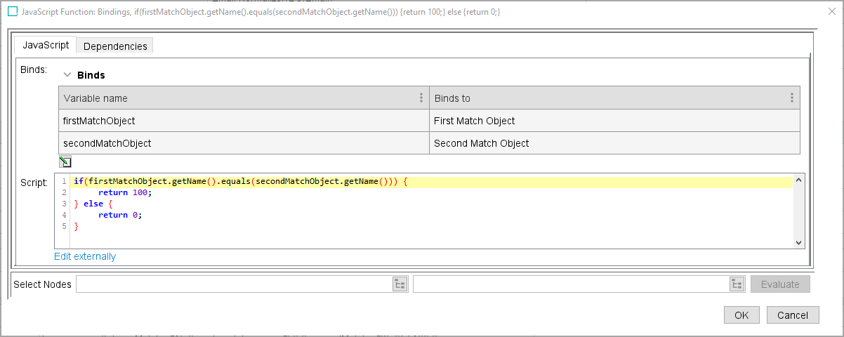 The first match object and second match object binds are used to access the first and second nodes respectively. The example below compares the name of one object to that of another and returns a score of either 100 (if they are a perfect match) or 0 (if they are not a match).