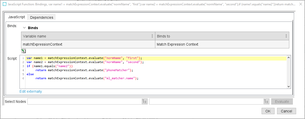 The match expression context bind is used by matchers, where two objects are in scope of the evaluation, so that the matcher can fetch data from a data element on both ‘first’ and ‘second’ objects. The example below compares the normalized legal names as text strings, and if they are a match it moves on to evaluate the phone number. If they are not a match, the name element of the Machine Learning Matcher is evaluated.
