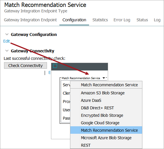 Under the Configuration tab, navigate below the 'Gateway Configuration' flipper and click Edit. From the dropdown, select 'Match Recommendation Service.'