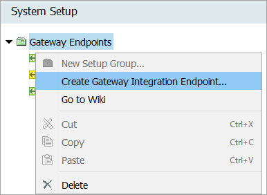 Under System Setup in the workbench, navigate to the Gateway Endpoints node. Right-click and select 'Create Gateway Integration Endpoint.'
