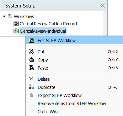 On the System Setup tab in the workbench, navigate to Workflows, then right-click on the desired clerical review workflow and select 'Edit STEP Workflow' to display the STEP Workflow Designer.